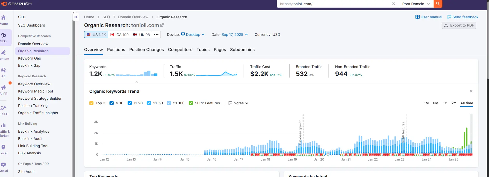 Tonioli experienced remarkable SEO growth, increasing from 1,500 to 3,400 monthly organic visits within 4–5 months — a 127% increase driven by strategic optimization and content refinement.